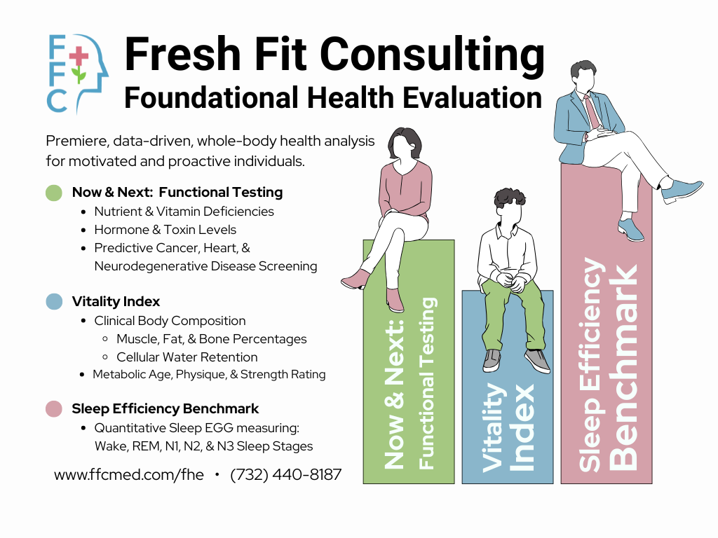 Fresh Fit Consulting’s Foundational Health Evaluation (FHE) is our premiere, data-driven, whole-body health analysis designed to create a practical health baseline, above and beyond what would normally be done during a routine physical.